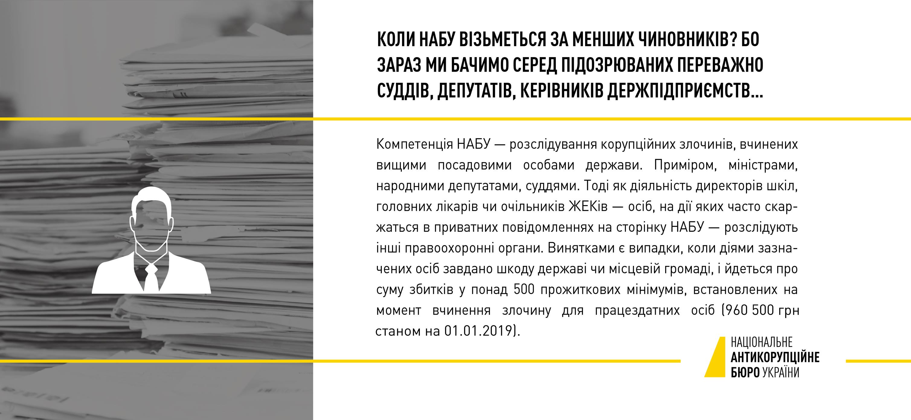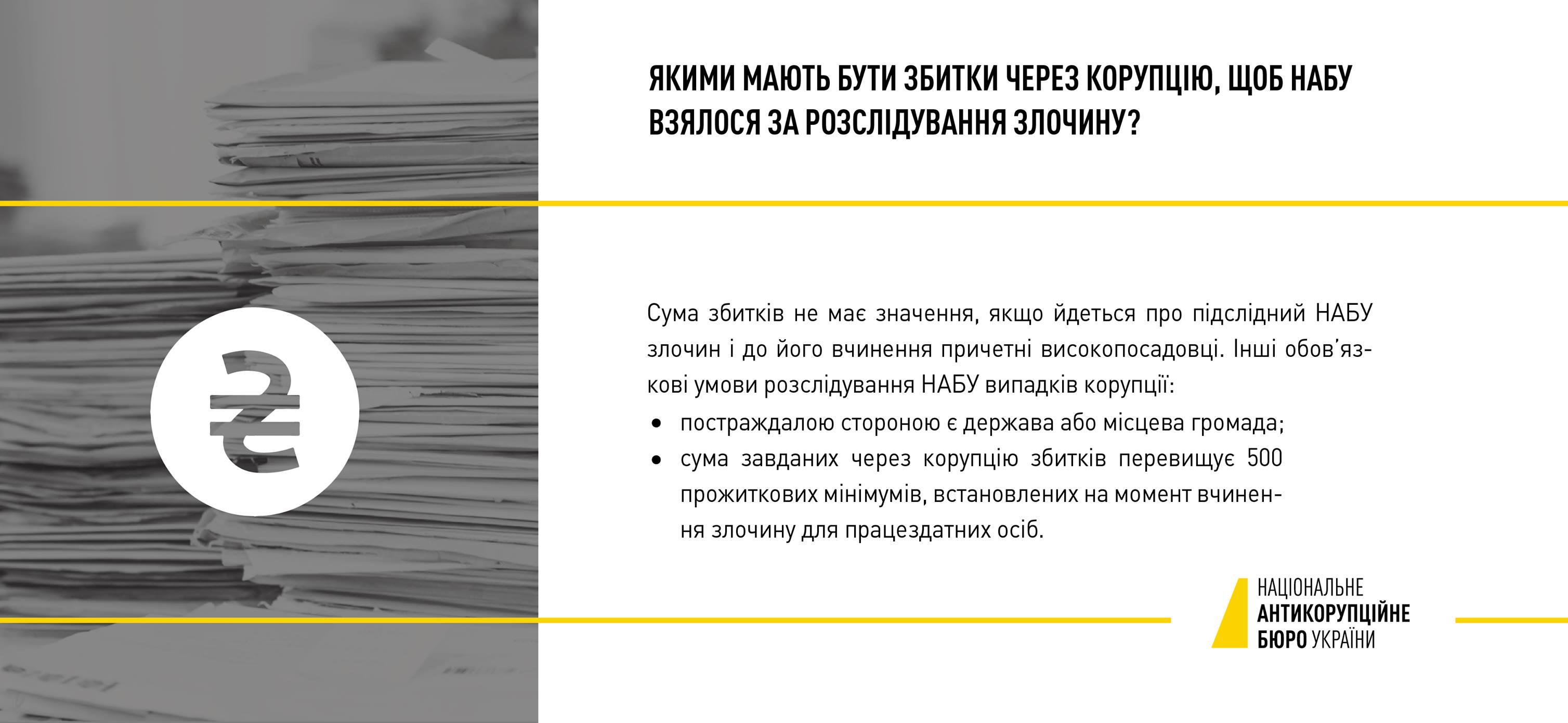 Впрочем, даже если эти два условия будут "выполнены", далеко не факт, что именно НАБУ будет заниматься их расследованием. Чтобы это произошло, необходимо, чтобы взошла еще одна звезда. А именно - установлена сумма ущерба в результате нанесенного подследственными Бюро фигурантами ущерба бюджету в размере от 960,5 тыс грн. Если же данный "потолок" не превышен, то дело могут зарегистрировать, но в дальнейшем, вероятнее всего, передадут в работу другим правоохранительным органам.