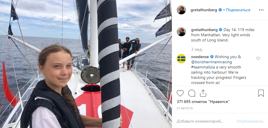 Впрочем, многие рассматривают эту поездку как очередную пиар-акцию, тем более что часть экипажа все равно отправилась в Америку на самолете, против которых выступает активистка, чтобы доставить яхту обратно в Европу.