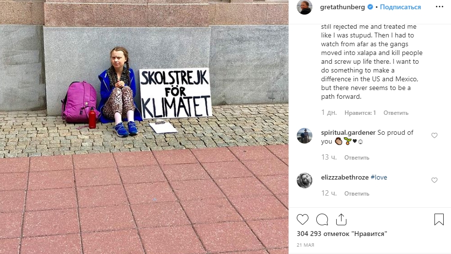 Она пришла к зданию шведского парламента и села с плакатом перед входом. На листовках, которые она раздавала прохожим, было написано: "Я делаю это, потому что вам, взрослым, плевать на мое будущее".