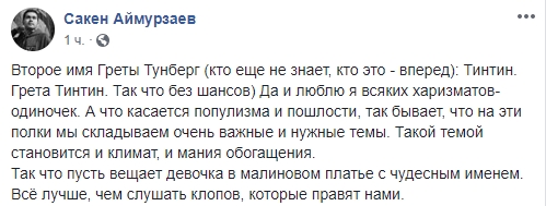Речь Греты понравилась и журналисту Сакену Аймурзаеву: "Второе имя Греты Тунберг (кто еще не знает, кто это - вперед): Тинтин. Грета Тинтин. Так что без шансов) Да и люблю я всяких харизматов-одиночек.