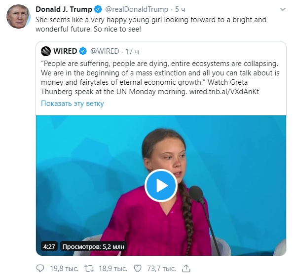 Сам Дональд Трамп опубликовал пост, посвященный Грете, который журналисты, правда, расценили как насмешку. Он запостил видео с гневной речью девочки и подписал: "Она выглядит счастливой молодой девушкой, которая ждет яркого и светлого будущего. Так приятно это видеть!"