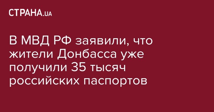 Уточняется, что помимо 35 тысяч российских паспортов жителям ОРДЛО было выдано 22 тысячи загранпаспортов. Всего российское МВД сообщило о более 87 тысячах заявлений о приеме в гражданство РФ в упрощенном порядке, поступивших от жителей Донбасса, в отношении 49 тысяч человек были приняты решения о приеме в гражданство.