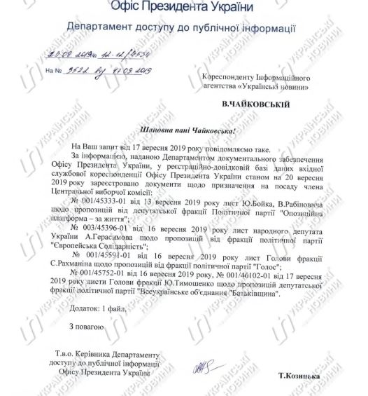 Согласно ответу Офиса президента, своевременно свои предложения внесла только фракция "Оппозиционная платформа - За жизнь". 13 сентября ОПЗЖ предложила Зеленскому две кандидатуры на должность членов ЦИКа: заместителя руководителя секретариата ЦИКа Сергея Дубовика и бывшего депутата парламента Юрия Мирошниченко.