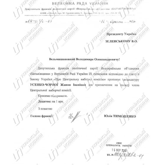 Фракция "Всеукраинское объединение "Батькивщина" публично сообщала лишь о внесении президенту кандидатуры главного консультанта отдела представительства в судах секретариата ЦИКа Виктории Глущенко. В то же время, согласно ответу Офиса президента, 16 сентября на имя Зеленского поступило подписанное председателем "Батькивщины" Юлией Тимошенко предложение о назначении Жанны Усенко-Черной - экс-члена ЦИКа от "Батькивщины" в 2004-2018, в том числе заместителя председателя комиссии с 2007 года. 17 сентября "Батькивщина" также внесла Зеленскому кандидатуру Глущенко для назначения членом ЦИКа, при этом в письме не говорится, что кандидатура Глущенко вносится вместо Усенко-Черной.