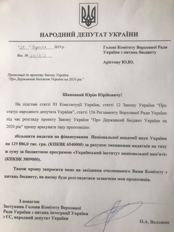 "Вот это вопрос небольшой, но очень значимый: в условиях хронической недофинансирования отечественной науки считаю преступным выделять большие деньги на детище Вятровича, виновное в разжигании вражды и ненависти в обществе. Внёс предложение о соответствующей коррекции проекта бюджета. Посмотрю, под каким предлогом представители "Слуг народа" решатся эту идею отклонить", - написал Волошин.