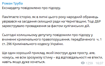 "Сегодня бывшему депутату сообщили о подозрении в совершении уголовного преступления, предусмотренного ч. 1 ст. 296 Уголовного кодекса Украины (хулиганство - Ред.). Еще один хороший пример, иллюстрирующий очень простую, но почему-то не всем понятную истину - от ответственности не уйти, даже если очень хочется", - написал Труба.