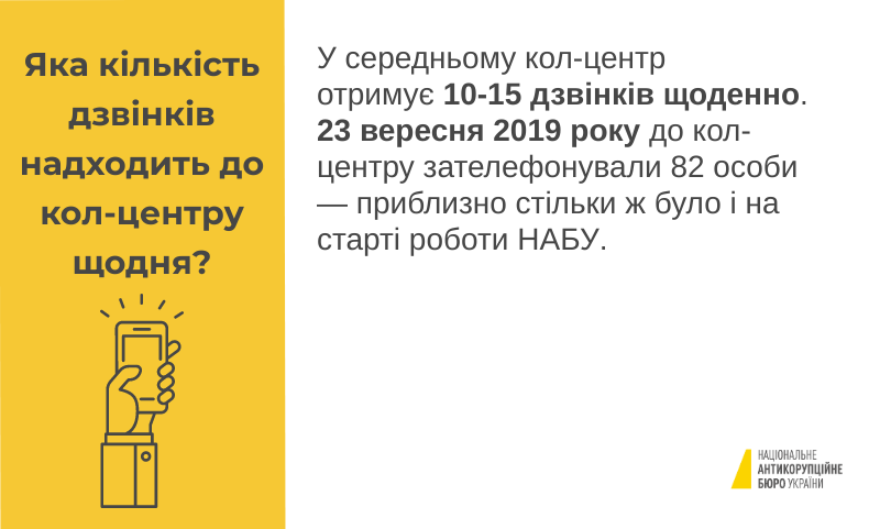 "В среднем колцентр получает 10-15 звонков ежедневно. 23 сентября в колцентр позвонили 82 человека. Примерно столько же было и на старте работы НАБУ", - сообщает бюро.