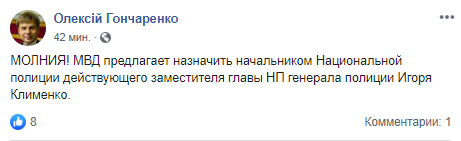 "МВД предлагает назначить начальником Национальной полиции действующего заместителя главы НП генерала полиции Игоря Клименко", - написал Гончаренко, находясь на закрытом заседании Кабмина.