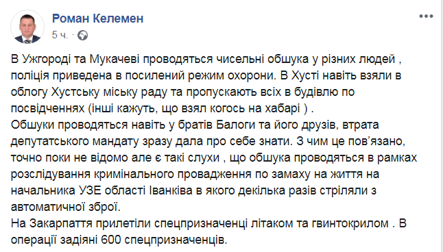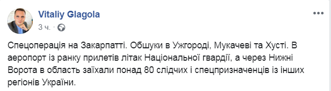 "Спецоперация на Закарпатье. Обыски в Ужгороде, Мукачево и Хусте. В аэропорт с утра прилетел самолет Национальной гвардии, а через Нижние Ворота в область заехали более 80 следователей и спецназовцев из других регионов Украины", - описал ситуацию журналист.