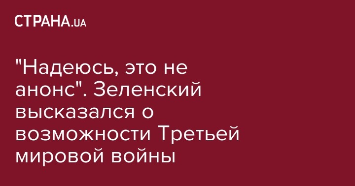 Президент Украины Владимир Зеленский заявил, что разговоры о возможности Третьей мировой войны, которая в случае ее начала будет последней для мира, являются следствием осознания ее угрозы, а "не анонсом".