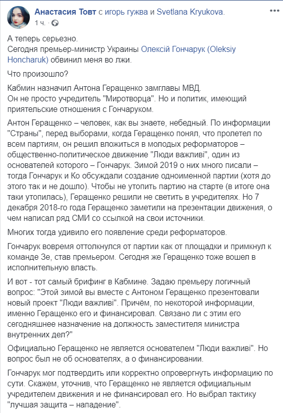 Журналист "Страны" Анастасия Товт объяснила за что премьер-министр Украины Алексей Гончарук обвинил ее во лжи во время брифинга в Кабинете министров, после вопроса о назначении Антона Геращенко заместителем главы МВД. Соответствующий пост опубликован в Facebook.