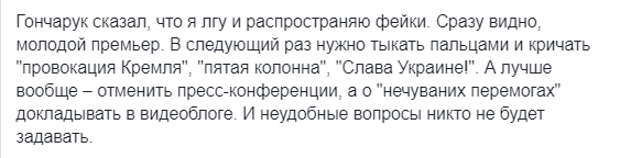 "Гончарук сказал, что я лгу и распространяю фейки. Сразу видно, молодой премьер. В следующий раз нужно тыкать пальцами и кричать "провокация Кремля", "пятая колонна", "Слава Украине!". А лучше вообще – отменить пресс-конференции, а о "нечуваних перемогах" докладывать в видеоблоге. И неудобные вопросы никто не будет задавать", - подытожила Товт.