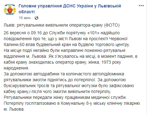 В четверг, 26 сентября, в 09:00, во Львове строительный кран упал на супермаркет. Об этом сообщает пресс-служба ГУ ГСЧС Львовской области. ЧП произошло на проспекте Красной калины.