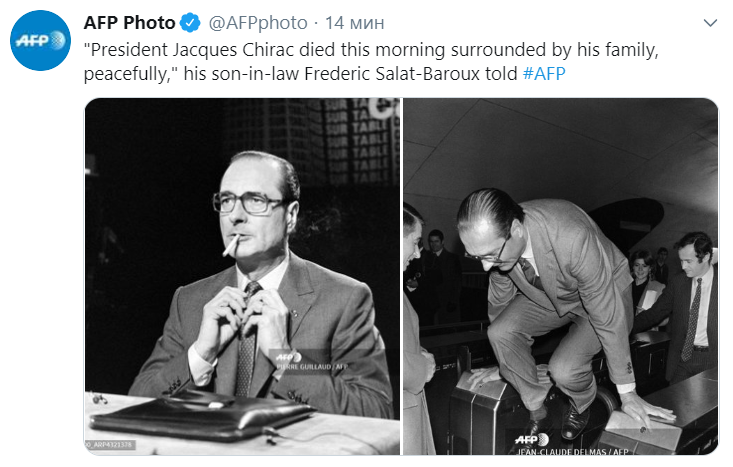 По словам его зятя Фредерика Салат-Бару, Жак Ширак мирно скончался сегодня утром в кругу своей семьи. О других обстоятельствах смерти не сообщается. В связи с его смертью Национальная ассамблея Франции приостановила свое заседание. Память Ширака почтили минутой молчания. Об этом рассказала депутат Аньес Тилль.