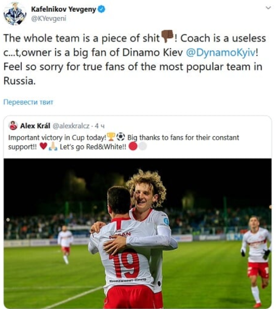 "Вся команда - кусок дерьма! Тренер - бесполезная #####, владелец - большой фанат киевского Динамо. Мне жаль истинных фанатов самой популярной команды в России", - написал Кафельников в Twitter, процитировав пост чеха.
