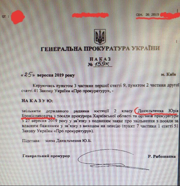 Харьковский бизнесмен Юрий Сапронов опубликовал в Facebook приказ об увольнении Данильченко. В документе указано, что прокурора Харьковской области увольняют по собственному желанию в связи с выходом на пенсию.