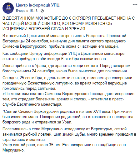 В Десятинный монастырь в Киеве привезли икону с частицей мощей святого праведного Симеона Верхотурского. Об этом сообщает Центр информации УПЦ в Facebook.