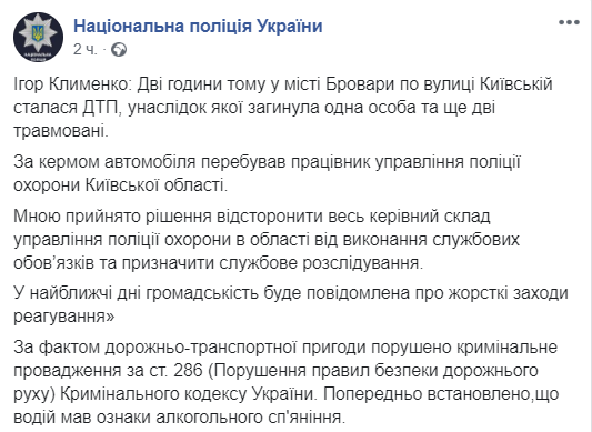 "В городе Бровары на улице Киевской произошло ДТП, в результате которого погиб один человек и еще два травмированы. За рулем автомобиля находился сотрудник управления полиции охраны Киевской области. Я принял решение отстранить весь руководящий состав управления полиции охраны в области от исполнения служебных обязанностей и назначить служебное расследование. В ближайшие дни общественность будет уведомлена о жестких мерах реагирования", - сообщил Клименко.