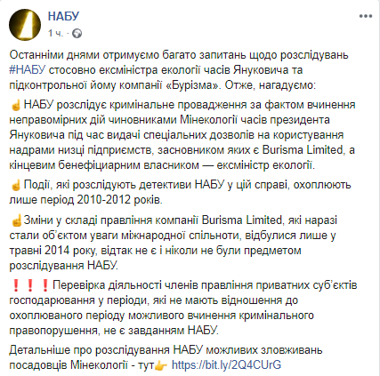 "События, которые расследуют детективы НАБУ по этому делу, охватывают лишь период 2010-2012 годов. Изменения, произошедшие в составе правления компании Burisma Limited, которые сейчас стали объектом внимания международного сообщества, произошли только в мае 2014 года, поэтому не являются и никогда не были предметом расследования НАБУ", - сказано в заявлении.