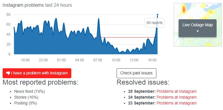 По данным сервиса, пользователи жалуются, что у них не обновляется лента новостей (74%), а также проблемы со сториз (16%) и размещением постов (9%). Судя по карте, сбой коснулся в основном стран центральной Европы.