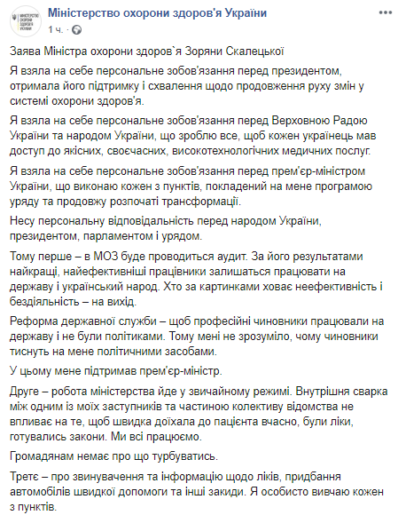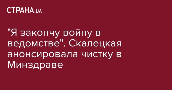 Министр здравоохранения Зоряна Скалецкая анонсировала проведение кадрового аудита в Минздраве, чтобы закончить "войну" в ведомстве. Об этом она написала на странице МОЗ в соцсети.