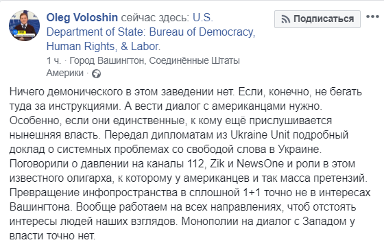 "Передал дипломатам из Ukraine Unit подробный доклад о системных проблемах со свободой слова в Украине. Поговорили о давлении на каналы 112, Zik и NewsOne и роли в этом известного олигарха, к которому у американцев и так масса претензий. Превращение инфопространства в сплошной 1+1 точно не в интересах Вашингтона. Вообще работаем на всех направлениях, чтоб отстоять интересы людей наших взглядов. Монополии на диалог с Западом у власти точно нет", - написал Волошин.