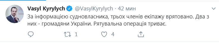 "По информации судовладельца, троих членов экипажа спасли. Два из них – граждане Украины. Спасательная операция продолжается", - написал Кирилич в микроблоге.