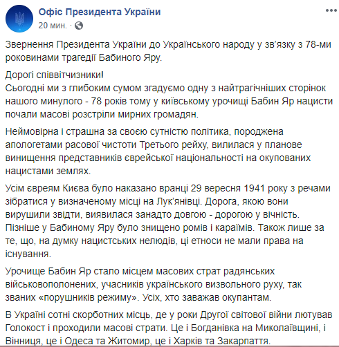 Президент Украины Владимир Зеленский сделал обращение в связи с 78-й годовщиной трагедии Бабьего Яра. Об этом в Facebook сообщает пресс-служба ОПУ.