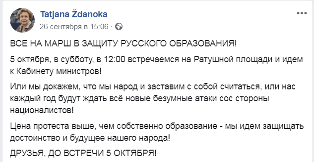 На следующих выходных состоится акция протеста в защиту русских школ, организованная Русским союзом Латвии (РСЛ). Акцию анонсировала в своем Facebook лидер РСЛ Татьяна Жданок.