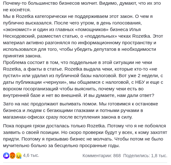 "Мы в Rozetka категорически не поддерживаем этот закон. О чем я публично высказался. После чего утром, в день голосования, "экономист" и один из главных "помощников" бизнеса Илья Несходовский, разместил статью, о "поддельных" чеках Rozetka. Этот материал активно разгонялся по информационному пространству и использовался для того, чтобы убедить депутатов в необходимости принятия закона" - написал Чечёткин.