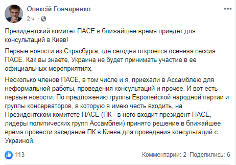 Нардеп также сообщил, что несколько членов ПАСЕ, в том числе Гончаренко, приехали в Ассамблею "для неформальной работы, проведения консультаций и прочее".