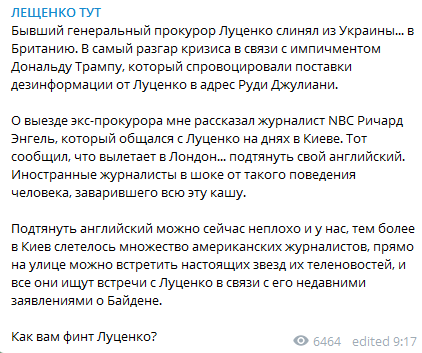 Лещенко узнал об этом от журналиста NBC Ричарда Энгеля, который общался с бывшим генпрокурором на днях в Киеве. Тот сообщил, что вылетает в Лондон, чтобы "подтянуть свой английский".