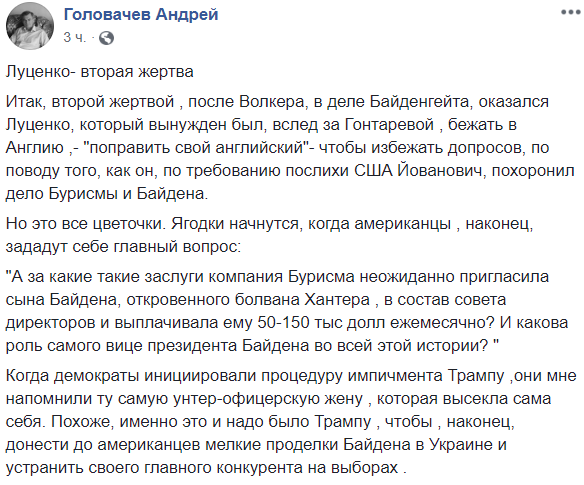"Итак, второй жертвой, после Волкера, в деле Байденгейта, оказался Луценко, который вынужден был, вслед за Гонтаревой , бежать в Англию , – "поправить свой английский" – чтобы избежать допросов по поводу того, как он, по требованию послихи США Йованович, похоронил дело "Бурисмы" и Байдена.