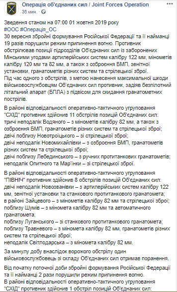 "За минувшие сутки в результате вражеского обстрела один военнослужащий из состава Объединенных сил получил ранения", – говорится в сводке, обнародованной утром 1 октября.