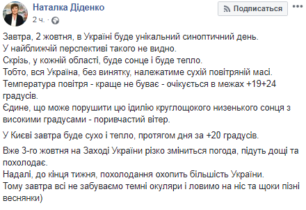 "Завтра, 2 октября, в Украине будет уникальный синоптический день. В ближайшей перспективе такого не видно. Везде, в каждой области, будет солнце и будет тепло", - написала Наталья Диденко.