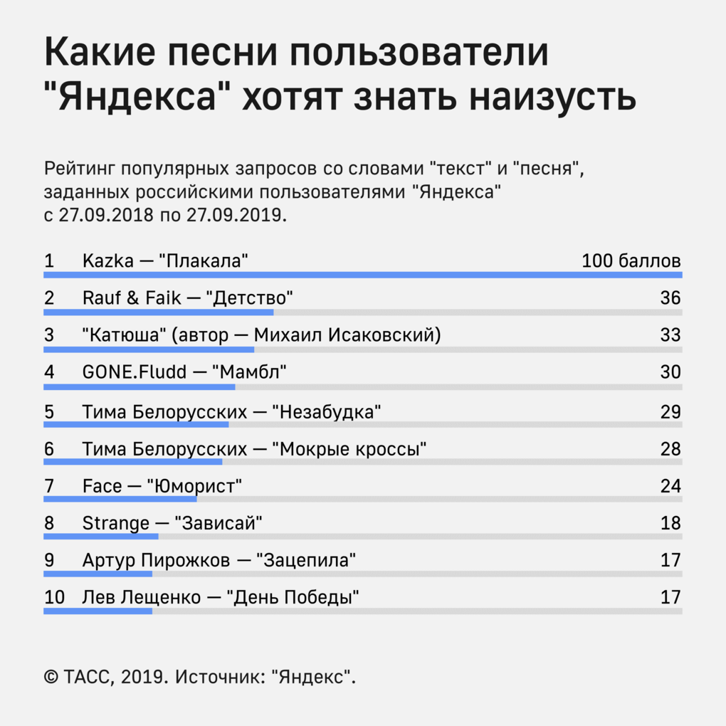 В рейтинг на основе популярных запросов со словами "текст" и "песня" также вошли композиции "Мамбл" GONE.Fludd (30 баллов),"Незабудка" и "Мокрые кроссы" Тима Белорусских (29 и 28 баллов), "Юморист" Face (24), "Зацепила" Артура Пирожкова (17) и "День Победы" в исполнении Льва Лещенко (17).