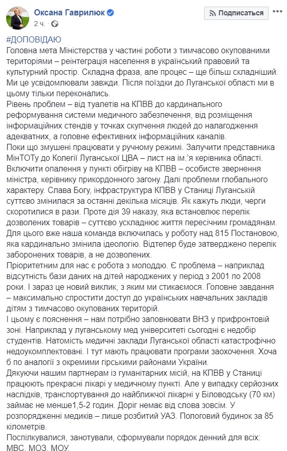 "С 29 октября должны были измениться правила пересечения КПВВ между временно оккупированными территориями и подконтрольными украинской власти, в частности, для детей до 14 лет. По новым правилам при пересечении линии разграничения дети должны были бы иметь загранпаспорт. Получив многочисленные обращения граждан и проанализировав ситуацию, Министерство по делам ветеранов, временно оккупированных территорий и внутренне перемещенных лиц приняло решение о необходимости отсрочить вступление в силу этих правил", - говорится в сообщении властей.