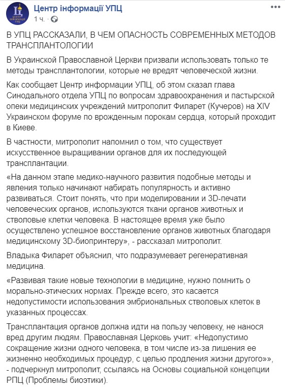 Украинская Православная Церковь призвала использовать только не методы трансплантологии, которые не наносят вред жизни человека. Об этом сообщает Центр информации УПЦ в Facebook.