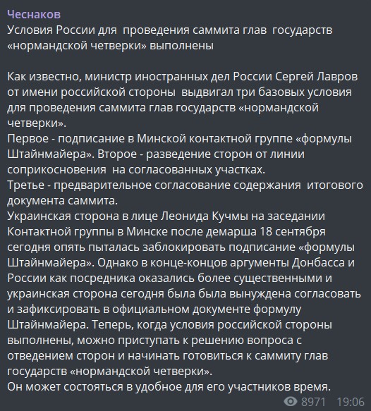 "Украинская сторона в лице Леонида Кучмы на заседании Контактной группы в Минске после демарша 18 сентября сегодня опять пыталась заблокировать подписание "формулы Штайнмайера". Однако в конце-концов аргументы Донбасса и России как посредника оказались более существенными и украинская сторона сегодня была была вынуждена согласовать и зафиксировать в официальном документе формулу Штайнмайера. Теперь, когда условия российской стороны выполнены, можно приступать к решению вопроса с отведением сторон и начинать готовиться к саммиту глав государств "нормандской четверки", - пишет политолог.
