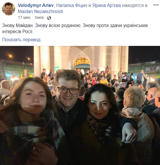 Также на этом митинге присутствует нардеп от "Европейской солидарности" Владимир Арьев. "Опять Майдан. Опять всей семьей. Опять против сдачи украинских интересов России", - написал он.