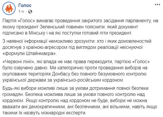Партия "Голос", которая сегодня митинговала под Офисом президента, потребовала созыва закрытого заседания парламента. На нем Зеленский, считают у Вакарчука, должен зачитать документ, под которым Леонид Кучма подписался в Минске.