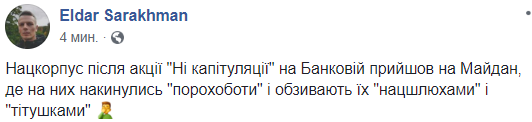 "Нацкорпус после акции "Нет капитуляции" на Банковой пришел на Майдан, где их набросились "порохоботы" и обзывают их "нацшлюхами" и "титушками", - пишет журналист Элдар Сарахман.