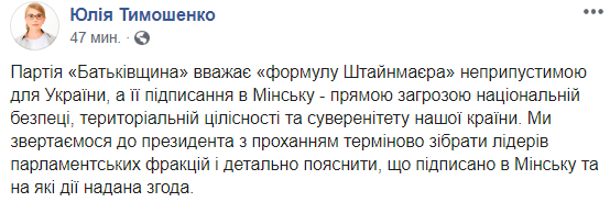 "Партия "Батькивщина" считает "формулу Штайнмайера" недопустимой для Украины, а ее подписание в Минске - прямой угрозой национальной безопасности, территориальной целостности и суверенитету нашей страны. Мы обращаемся к президенту с просьбой срочно собрать лидеров парламентских фракций и подробно объяснить, что подписано в Минске и на какие действия дано согласие".