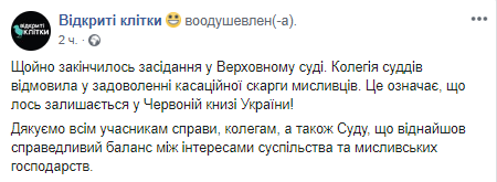 "Только что закончилось заседание в Верховном Суде. Коллегия судей отказала в удовлетворении кассационной жалобы охотников. Это означает, что лось остается в Красной книге Украины! Спасибо всем участникам дела, коллегам, а также суду, который нашел справедливый баланс между интересами общества и охотничьих хозяйств", - говорится в сообщении.