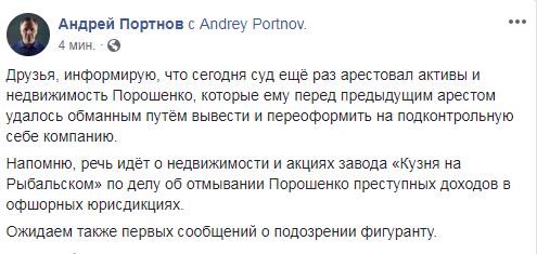"...Сегодня суд еще раз арестовал активы и недвижимость Порошенко, которые ему перед предыдущим арестом удалось обманным путём вывести и переоформить на подконтрольную себе компанию. Напомню, речь идет о недвижимости и акциях завода "Кузня на Рыбальском" по делу об отмывании Порошенко преступных доходов в офшорных юрисдикциях", - сообщил Портнов.