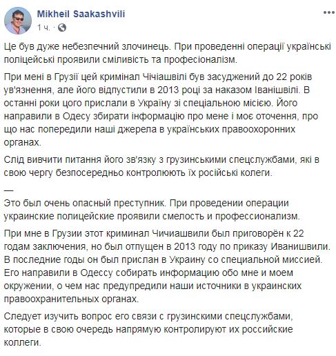 "Это был очень опасный преступник. При мне в Грузии этот криминал Чичиашвили был приговорен к 22 годам заключения, но его отпустили в 2013 году по приказу Иванишвили. В последние годы этого прислали в Украину со специальной миссией", - сказано в сообщении.