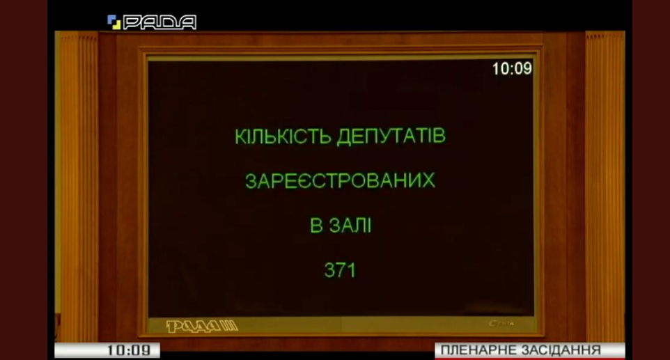 10:05 Заседание Верховной Рады открыто. В зале зарегистрировался 371 депутат.