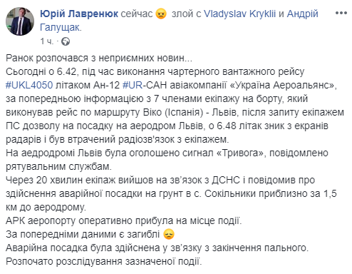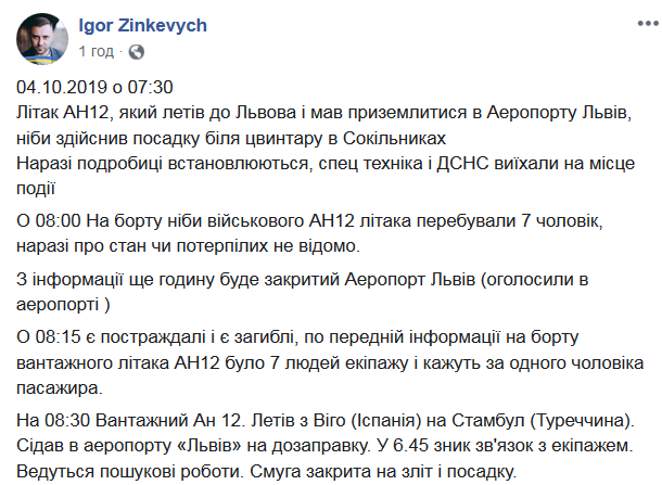 О крушении в 08:30 сообщил депутат и член ГО "Варта 1" Игорь Зинкевич. По его данным, самолет Ан-12 должен был приземлиться в аэропорту "Львов", но в 07:30 совершил внезапную посадку у кладбища в Сокольниках (пригород Львова) - самолет не дотянул полтора километра до посадочной полосы. На борту транспортного Ан-12 находились 7 человек (позже выяснилось, что 8, экипаж и 1 сопровождающий груз - Ред.).