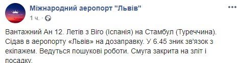 По данным на 08:30 выяснилось, что это грузовой Ан-12, который летел из Виго (Испания) в Стамбул (Турция). Он садился в аэропорту "Львов" на дозаправку. В 06:45 пропала связь с экипажем.