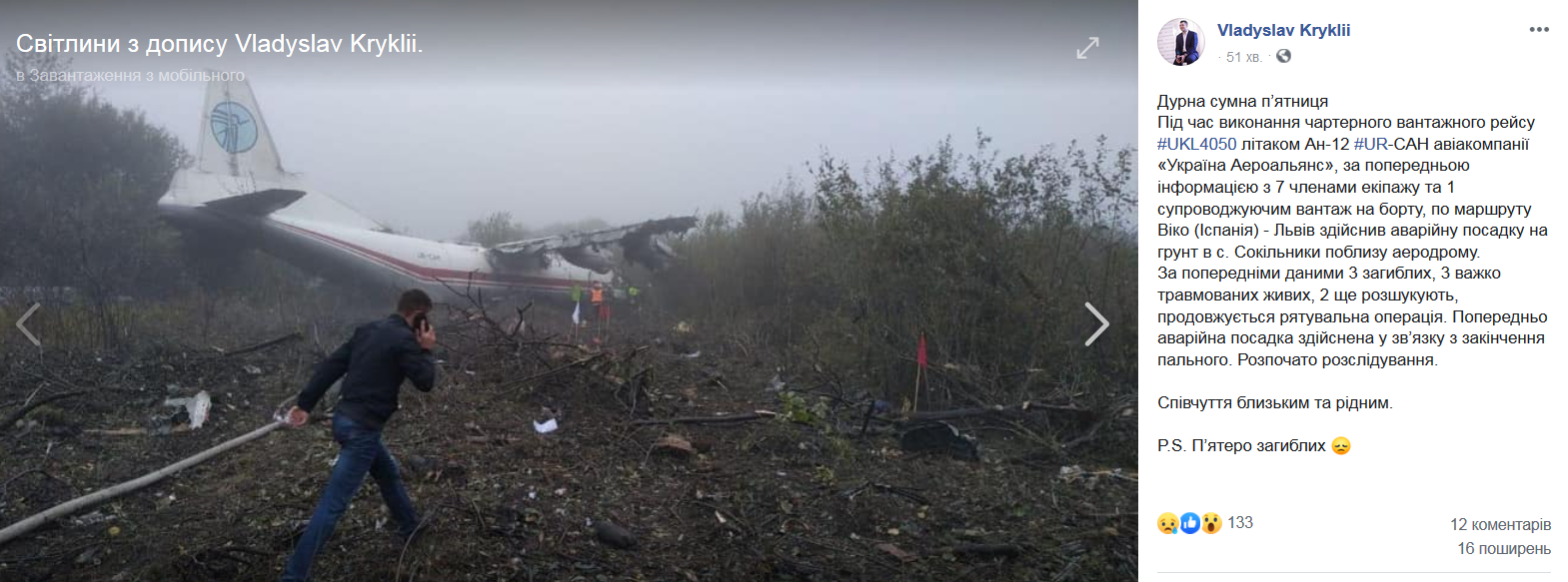 "Во время выполнения чартерного грузового рейса UKL4050 самолет Ан-12 UR-CAH авиакомпании "Украина Аэроальянс", по предварительной информации с 7 членами экипажа и 1 сопровождающим груз на борту, по маршруту Вико (Испания) - Львов совершил аварийную посадку на грунт в с. Сокольники вблизи аэродрома. По предварительным данным 3 погибших, 3 тяжело травмированных живых, 2 еще разыскивают, продолжается спасательная операция. Предварительно аварийная посадка осуществлена ​​в связи с окончанием горючего. Начато расследование. Соболезнования близким и родным.